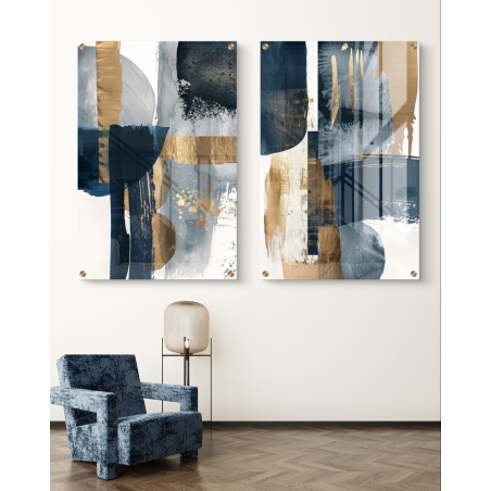 "איזון מופשט" -זוג תמונות זכוכית גאומטרית בגוונים זהב/כחול דגם -C99602